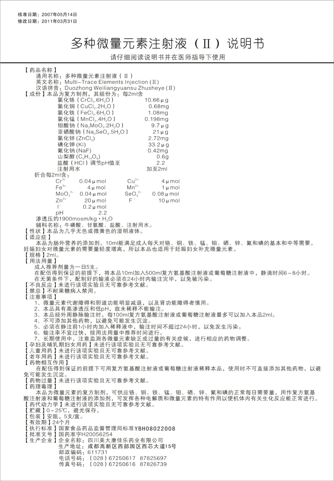【通用名】多種微量元素注射液(Ⅱ)