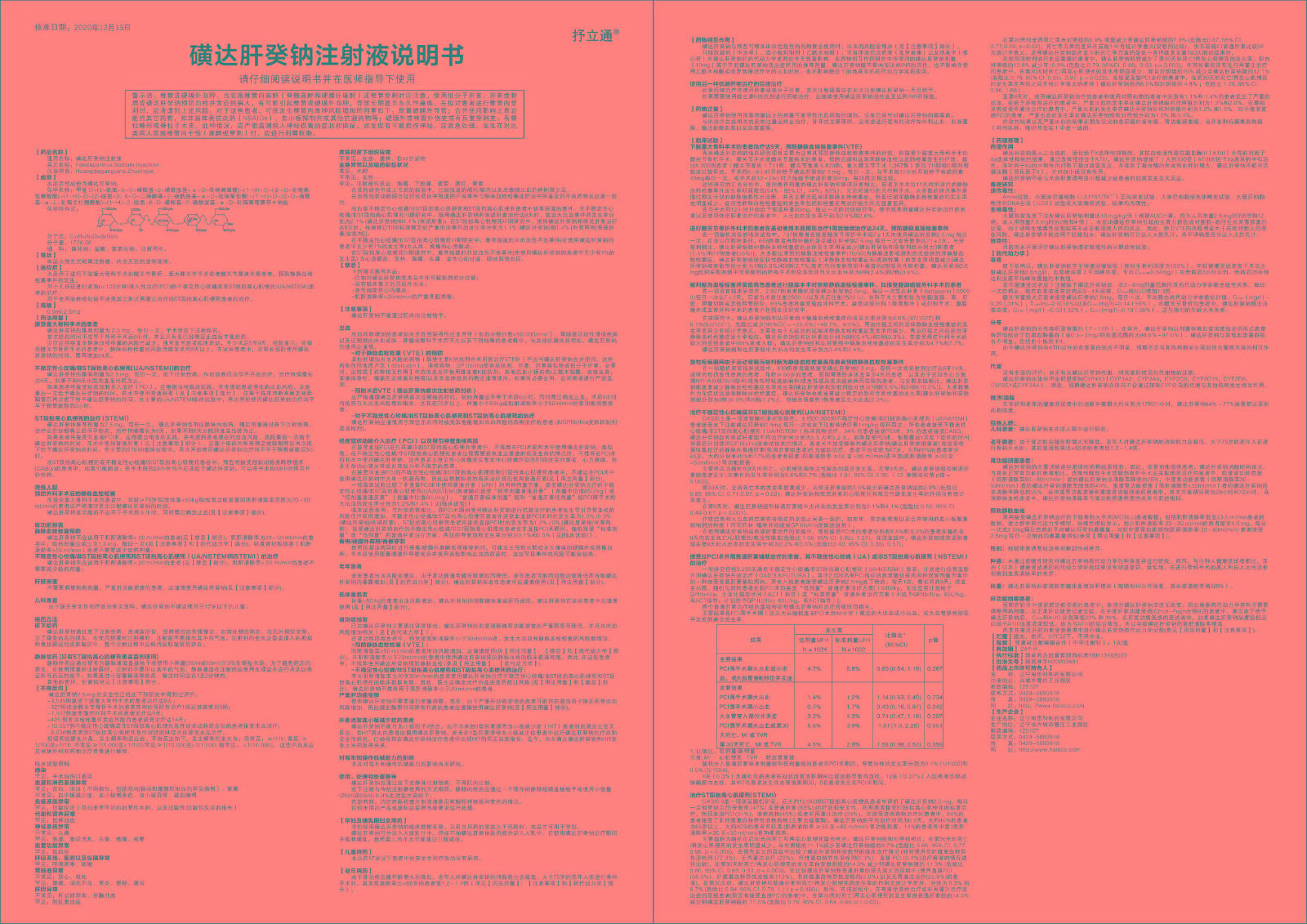 本品用于進(jìn)行下肢重大骨科手術(shù)如髖關(guān)節(jié)骨折、重大膝關(guān)節(jié)手術(shù)或者髖關(guān)節(jié)置換術(shù)等患者,預(yù)防靜脈血栓栓塞事件的發(fā)生。用于無指征進(jìn)行緊急(<120分鐘)侵入性治療(PCI)的不穩(wěn)定性心絞痛或非ST段抬高心肌梗死(UA/NSTEMI)患者的治療。用于使用溶栓或初始不接受其它形式再灌注治療的ST段抬高心肌梗死患者的治療。